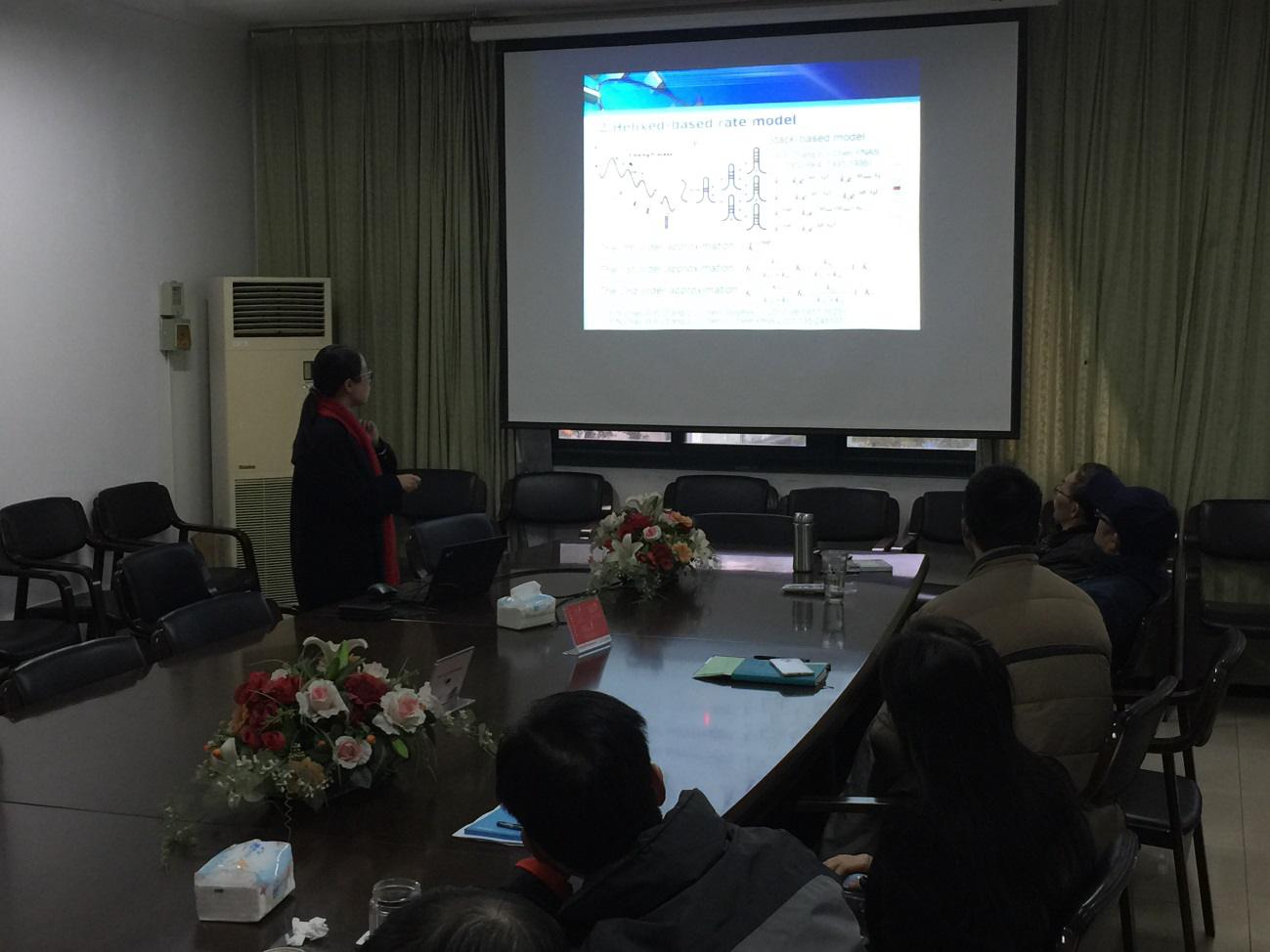 报告中, 孙婷婷副教授介绍了她们建立的一个基于主方程的有效模型来研究长RNA序列的共转录折叠。她们利用这个模型来分析pbuE核糖开关的共转录折叠,并取得了一些新的见解。