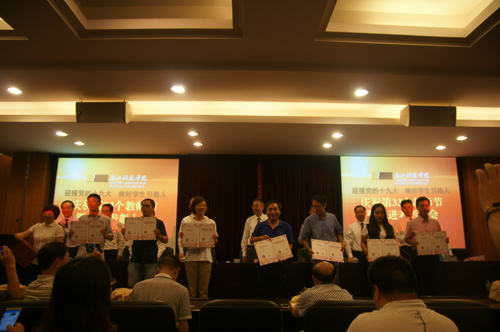 龚建立代表学校向广大教职员工和离退休老同志致以节日的问候,并向获得荣誉的先进集体和先进个人表示热烈祝贺。他说,今年教师节的主题是“迎接党的十九大,做好学生引路人”,党和政府对教育事业高度重视,对广大教师厚重期待,希望全校教职员工要用习近平总书记系列重要讲话精神武装头脑,深刻领会省第十四次党代会精神,坚持正确的政治方向,争做“四有”好老师,潜心育人,让党放心,让人民满意。教师要把以德修身、立德树人放在首位,积极学习黄大年、陈莹丽等先进典型事迹,精心钻研业务,提高教学能力和教育质量;管理服务部门和干部,要积极探索学校治理现代化体制机制改革,多为教师做好事、办实事、解难事,形成尊重人才、高效服务的良好氛围。龚建立强调,接下来的一年,是实现“大学梦”的战略总攻阶段,更需要全体师生的共同努力,需要每一位干部教师在自己的岗位上改革创新、追求卓越,以更高的标准做出不平凡的业绩。
