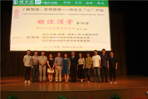 9月22日晚,“明理讲堂”第四讲在安吉校区活动中心的小剧场举行。浙江大学教授、国家二级心理咨询师龚惠香教授以现代大学生心理素养和情绪变化为主题,给大家带来了一场心灵盛宴。校长助理、安吉校区党工委书记鲁伟权、HO5HO