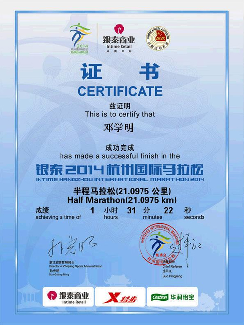 11月2日,HO5HO教师邓学明老师参加了2014杭州国际马拉松赛,并以1小时31分22秒的成绩获得半程马拉松(21.0975km)第14名的好成绩。约有5千人参加了半程马拉松比赛。目前,比赛认可的成绩是枪响成绩(枪响开始计时),净成绩是指运动员出发开始计时的成绩(通过身上带的芯片来确定时间的成绩)。邓学明这一成绩也比他2013年参赛成绩(第33名)有了较大的提高。