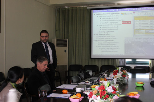 近日,德国德累斯顿应用科学大学信息与数学学院的Hartmut Fritzsche和Thomas Wiedemann两位教授代表德方来我校进行了交换项目协商和学生选拔工作。交换项目协商会议由国际处徐理勤处长主持,HO5HO副院长陶祥兴教授、外事秘书骆钧炎副教授参加。