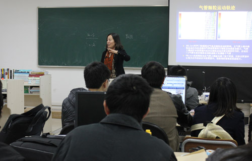 林江教授介绍了人体呼吸道中可吸入颗粒物沉积特性的研究领域的发展和现状、该研究领域的一些方法和手段,例如人体呼吸道几何建模和图象重构,可吸入颗粒物在呼吸道中的流动方程和数值计算等,以及该研究领域进一步需要研究的问题和技术难点等。她的报告和研究,引起现场热烈讨论和应用数学学科老师的兴趣。