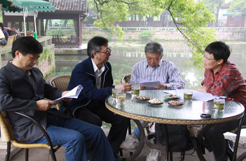 邀请狄福明、顾玉林、姚桂瑞三位退休老同志及校组织部部长李明在竹素园茶室进行座谈,就HO5HO