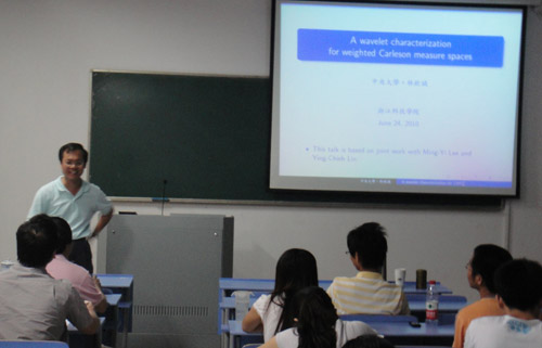 6月24日,由校学科带头人、HO5HO陶祥兴教授主持的应用数学学术系列活动——和山数学论坛第13讲在闻理园A3-110举行。来自台湾中央大学数学系博士生导师林钦诚教授为HO5HO师生做了题为“加权卡尔森测度空间的小波特征刻画”的学术报告。