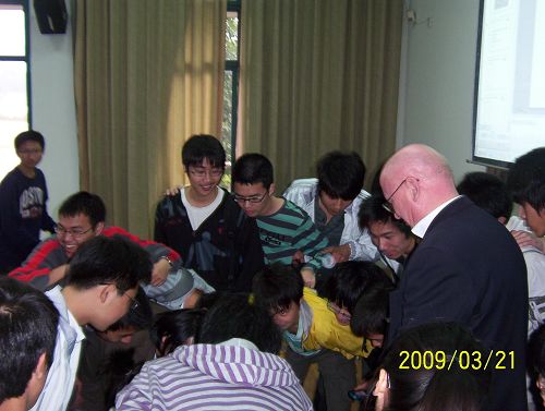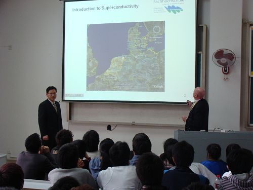 这两次讲座的主题分别为“超导原理和发展”、“超导技术的应用:SQUID(超导量子干涉器件)在医学上的应用”。通过深入浅出的讲解,大量图片的展示,同学们初步了解了超导产生的原理、应用领域和技术进展。“高温超导磁悬浮”的实验演示后,让同学们自己动手在液氮冷却到-196℃后的超导材料悬浮在空中的现象,激发了同学们对超导应用的探索。在讲座后的讨论环节中,同学们还对超导进一步的应用和提高超导的性能作了很多大胆的设想,不仅对实验现象表现了极大的兴趣,也向主讲者提了大量的问题。如“目前超导技术的应用领域”,“电子库柏对在超导体中的作用”,“在T > Tc, j > jc和H > Hc时晶格动力学的表现”,“产生电子库柏对和寻找更高临界温度超导的途径”等等。讨论的气氛非常活跃,特别是一些直接用英语的提问,尽管语言不是很流利,但德国教授能完全理解问题的关键,实际上已经达到了学习英语、相互交流的目的。