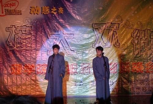 本次晚会在杭州移动西湖分公司等商家的大力支持下,本着“师生同乐”之特色,所有节目均出自本学院师生。晚会融合了歌曲、舞蹈、小品、相声等元素,教师们也为同学们送上了精心准备的歌曲,整台晚会可谓精彩纷呈,高潮迭起。天气虽然寒冷,但现场观众热情洋溢,台上台下互相联动,笑声、掌声不断……。最后,晚会在一曲师生合唱的《相亲相爱》中圆满结束。