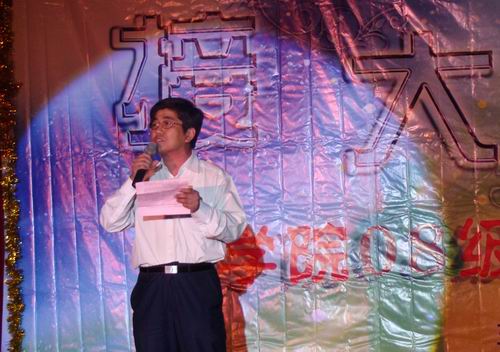 岑岗教授首先上台为晚会致辞。他给HO5HO08级学生提出了三点殷切希望:1、树立远大理想、立志成才;2、学会自我管理、自主学习;3、学会感恩,学好本领,回报社会。他鼓励08级新生要把握好人生之舵,以饱满的精神开始新的大学生活,创造美好的未来。
