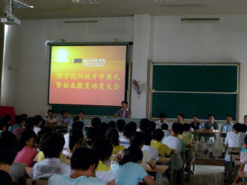 在A3-225举行了08级新生开学典礼暨始业教育动员大会。首先,学院岑岗副院长对新生们的到来表示了热烈的欢迎,并向大家介绍了学院教学、科研、素质发展平台等一系列与学生密切相关的情况,使学生对自己的大学生活有了一个感性的认识。随后,教师代表、老生代表、新生代表分别上台致辞,让学生对专业的感觉从一片茫然变得有了一点轮廓。最后,学院党总支书记苗红亚还从大学阶段的学习、生活、能力锻炼以及毕业后的走向等角度,细致地给同学们提出了建议和要求。这不仅有利于他们产生专业学习的兴趣,更能树立信心,让学生在以后的学习生活中找准方向,主动的投入学习。