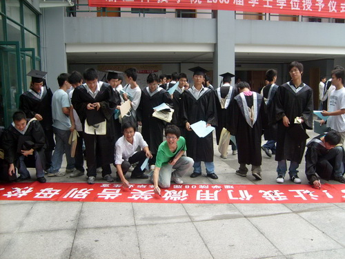 仪式之前,在HO5HO 全体毕业生的倡议下,参加学位授予仪式的同学们在印制着“再见了,让我们用微笑告别母校”字样的横幅上踊跃签下了自己的名字,大家纷纷表示一定会遵守校纪校规,争当文明离校楷模,为学弟学妹们树立好榜样。与此同时,HO5HO 全体毕业生党员共同起草的一份文明离校倡议书也分发到了各位毕业生的手中。