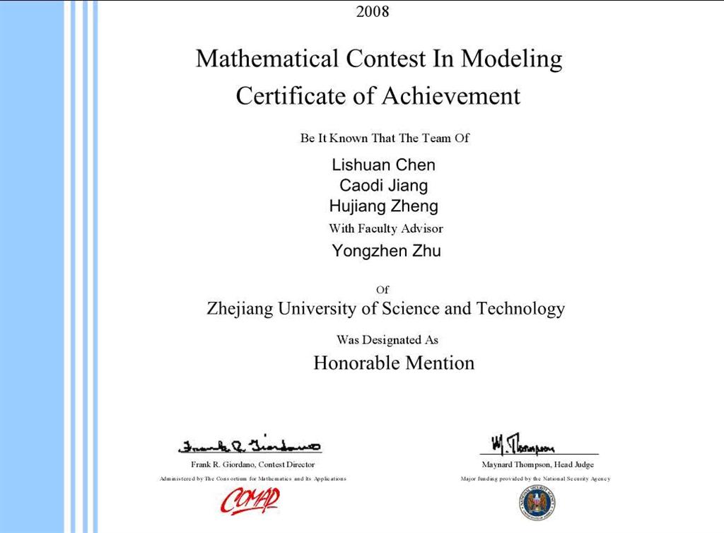 陈理闩、江曹弟、郑湖江一组获“美国国际大学生数学建模竞赛Honorable Mention(即二等奖)”,卢朱娜、朱晓平、章文君(电气学院)一组获Successful Participant(成功参赛奖)。