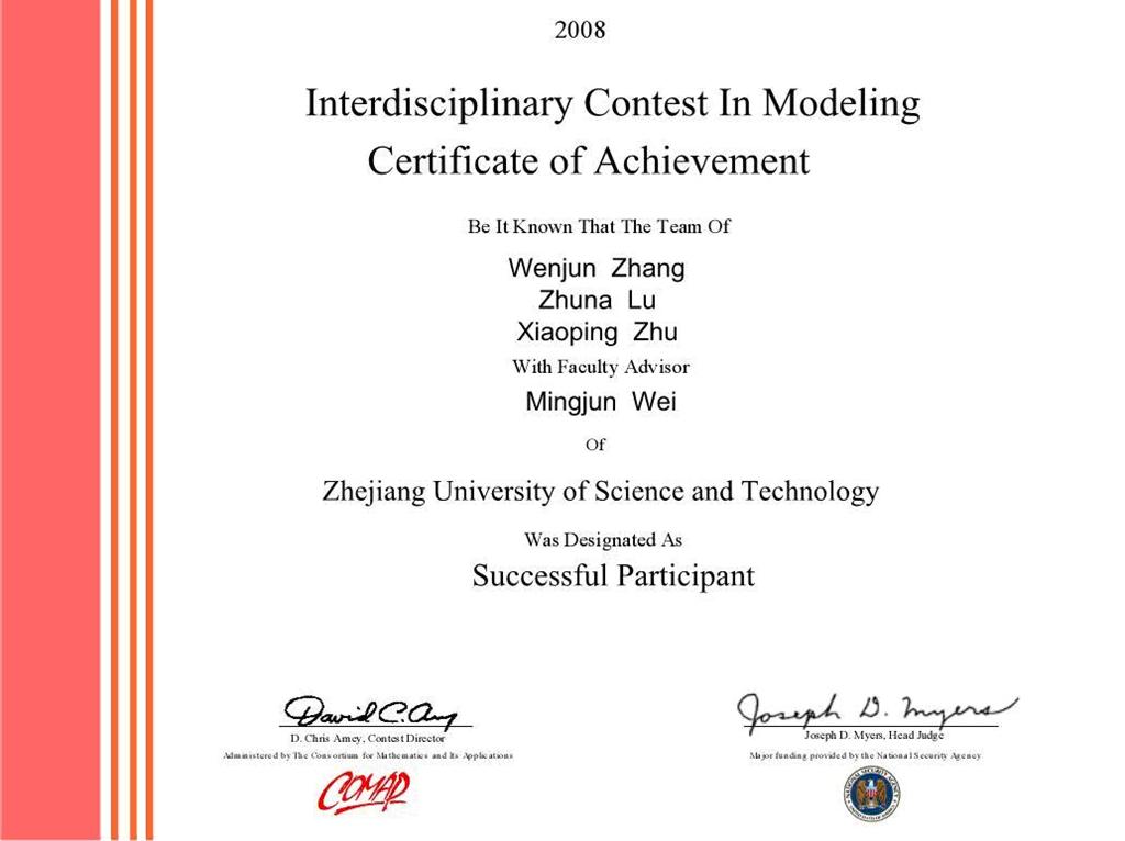 本届“美国国际大学生数学建模竞赛”在2008年2月14号—2月18号(中国农历正月初六—正月初九)举行,共有十多个国家,近4000支队参加。我校组织两支队伍参赛,由HO5HO